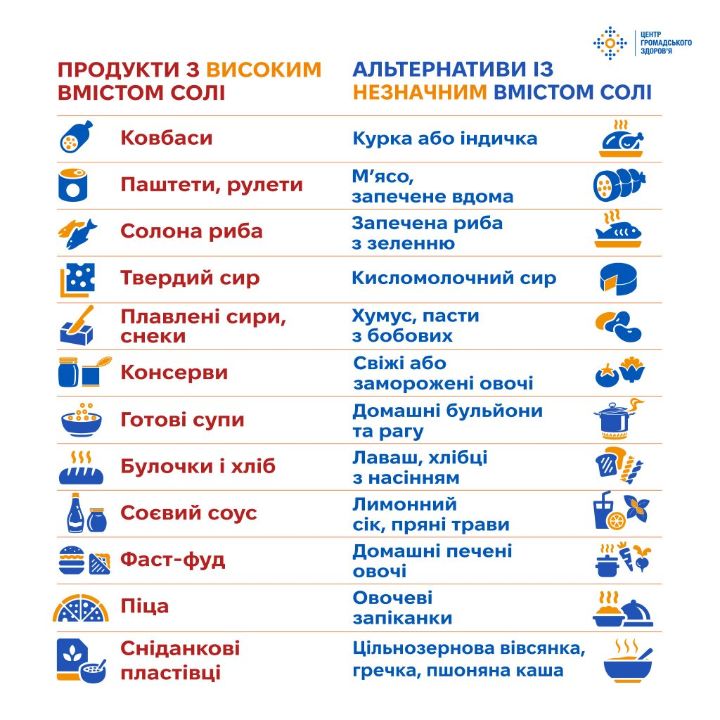 ✅ Контролюйте, скільки солі додаєте у страви вдома — під час приготування їжі, у соусах і консервації.