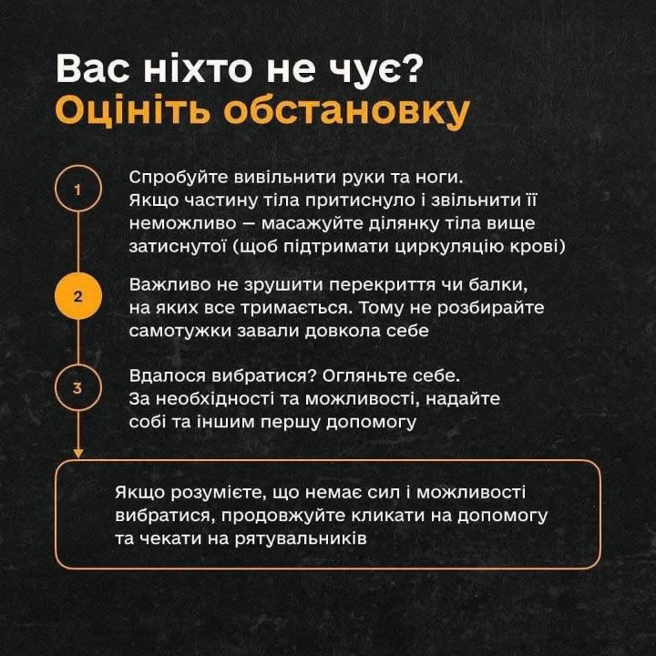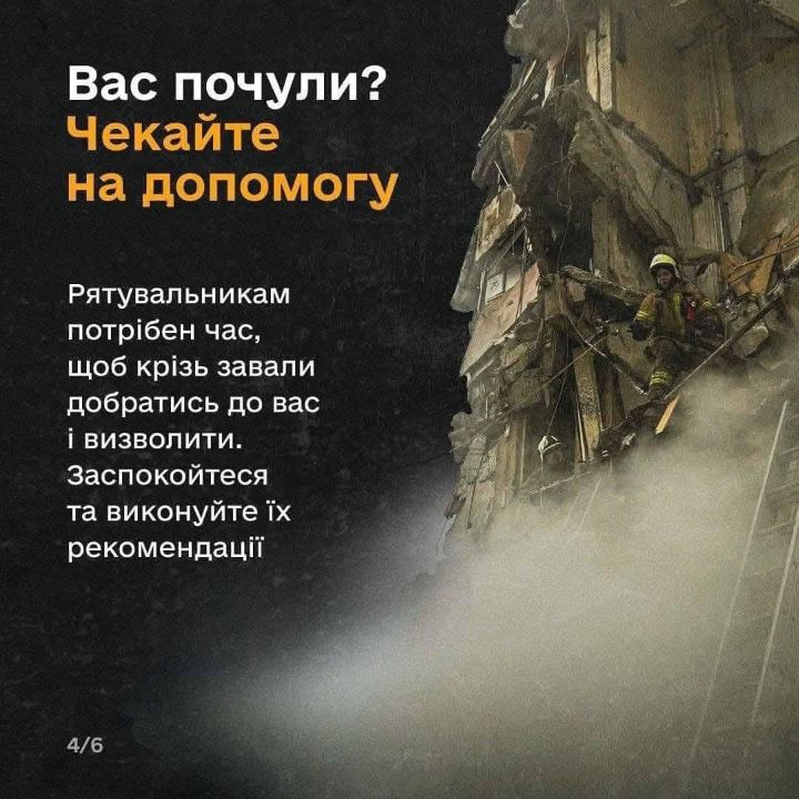 ✅Чекайте на допомогу. Рятувальникам потрібен час, щоб крізь завали добратись до вас і визволити. Заспокойтеся та виконуйте їхні рекомендації