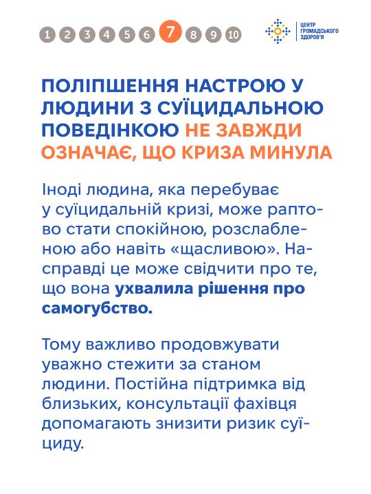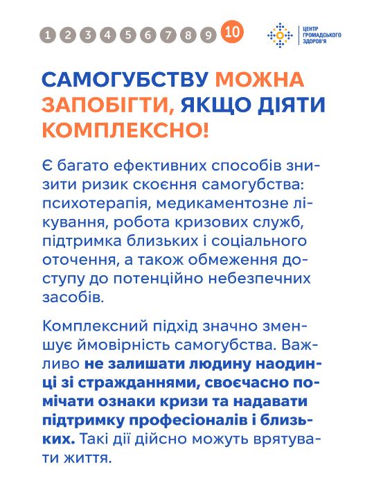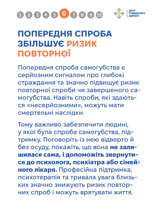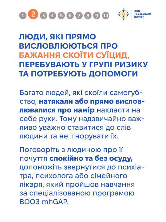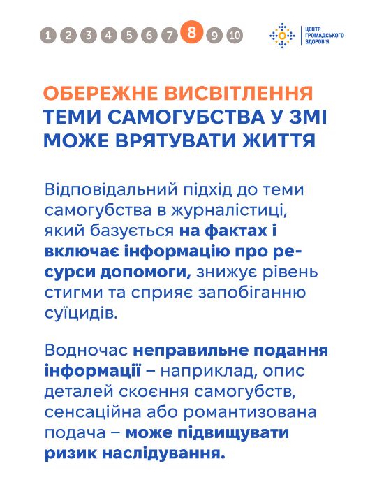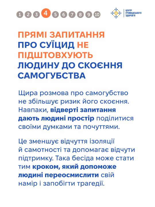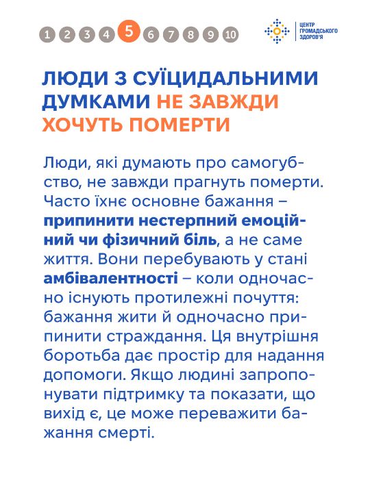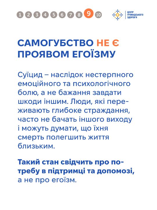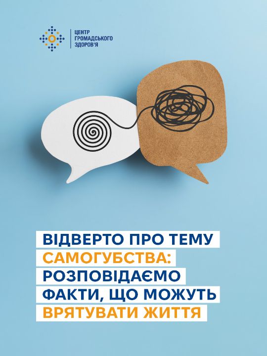 Тема самогубства оповита упередженнями, які спотворюють розуміння цієї проблеми та заважають людям отримати чи надати належну підтримку. Важливо говорити на цю тему щиро та відповідально — без сенсаційності чи осуду, з опорою на факти. Це допомагає руйнувати стигму й створює більше простору для діалогу та допомоги. Дивіться інфографіку від Центру громадського здоров'я, щоб дізнатись більше про тему самогубства та як допомогти людині в кризі.