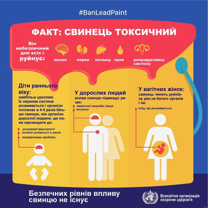 🌐 Всесвітня організація охорони здоров'я (ВООЗ) включила свинець до списку 10 хімічних речовин, найбільш небезпечних для дітей і жінок репродуктивного віку. За даними ВООЗ, цей метал, потрапивши в організм, накопичується і чинить токсичний вплив на мозок, нервову систему, систему крові, травну, серцево-судинну системи та нирки.